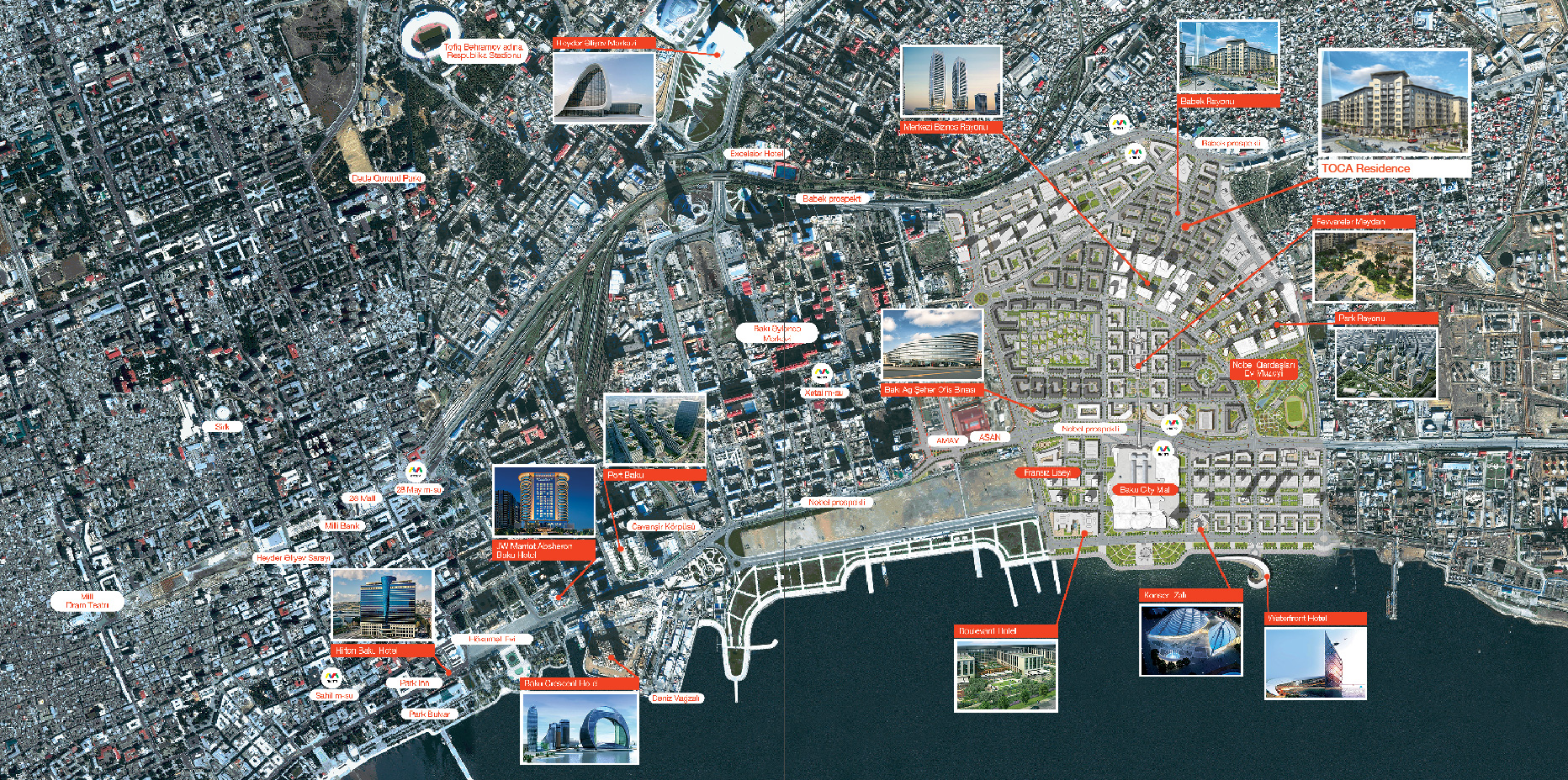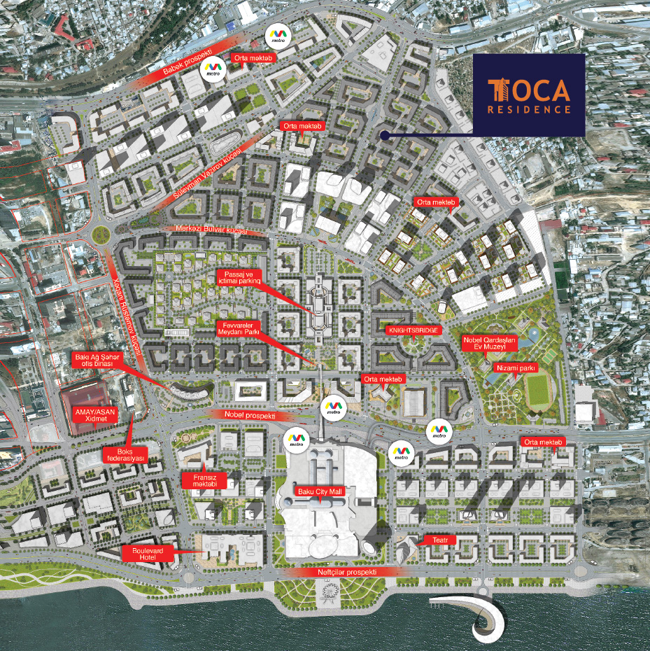 Kompleksin əlverişli yerləşməsi Ağ Şəhərdən Babək və Nobel prospektlərinə rahat keçidi təmin edərək, oradan eynilə həm şəhərin tarixi mərkəzinə, həm də Heydər Əliyev beynəlxalq hava limanına getməyi asanlaşdırır. Babək rayonunun şimal hissəsində - Babək prospekti boyunca 4 çıxışı olan yeni metro stansiyası planlaşdırılıb. Qonşuluqda layihələndirilmiş orta məktəblər, parklar, müasir biznes və ticarət mərkəzləri TOCA Residence yaşayış kompleksini yaşamaq üçün ən rahat və cəlbedici yerlərdən birinə çevirir.