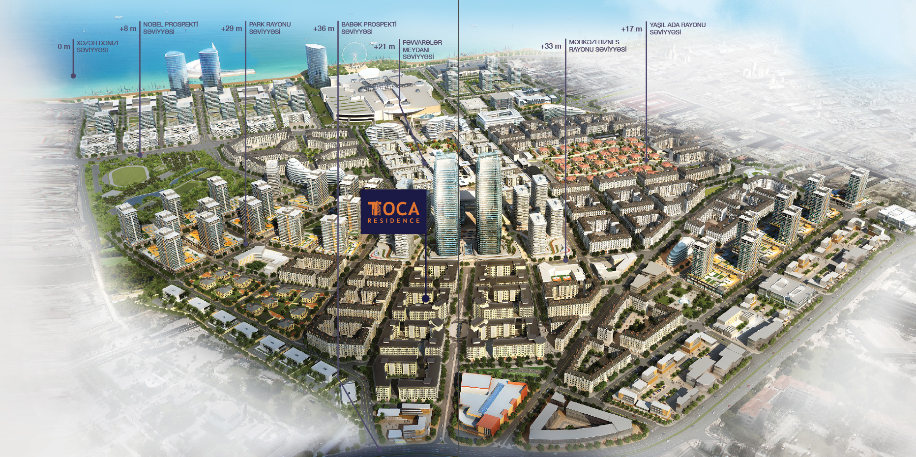 TOCA Residence yaşayış kompleksi dəniz səviyyəsindən 25m artıq hündürlükdə, 8 mərtəbəli yaşayış kvartallarından ibarət və tikili sıxlığı aşağı olan Bakı Ağ Şəhər-in Babək rayonunun mərkəzi meydanında yerləşir. Ərazini qərb və şərq hissəsinə ayıran, Mərkəzi prospektin ortasında yerləşən zərif heykəltəraşlıq ilə bəzədilmiş meydan bu rayonun qəlbi olacaqdır.
